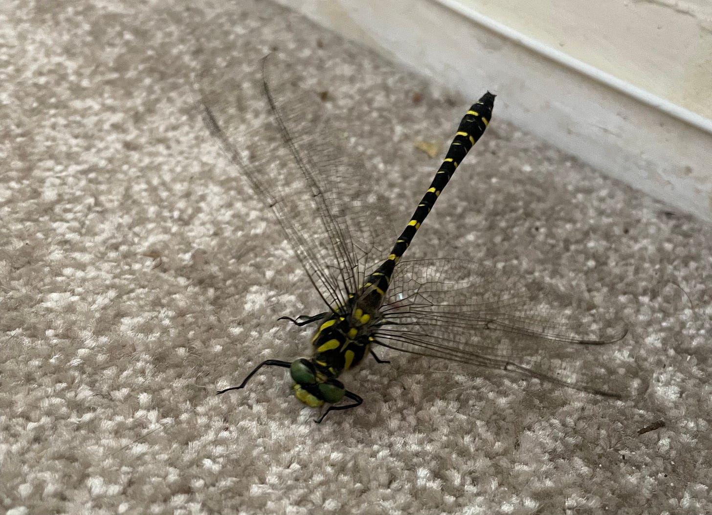 I would like to share a concern. My cat keeps attacking the local wildlife. If you have read some of my previous work, you will know this is a rare but distressing occurrence. However, we have had the misfortune of her bringing back not one, but two golden-ringed dragonflies in the space of two days. I’ve popped a picture of one of the poor little fellas down below. This little guy got away with a little wing damage, but nothing major – I managed to rescue him in time. He flew away quite happily. The one yesterday, though, he was snapped in half. He’s not going anywhere anytime soon. Golden-ringed dragonflies are the longest species of dragonfly that live in the UK, and are not uncommon across the country and parts of Europe, but are localised enough for me to feel like she may be facilitating an ecological disaster.